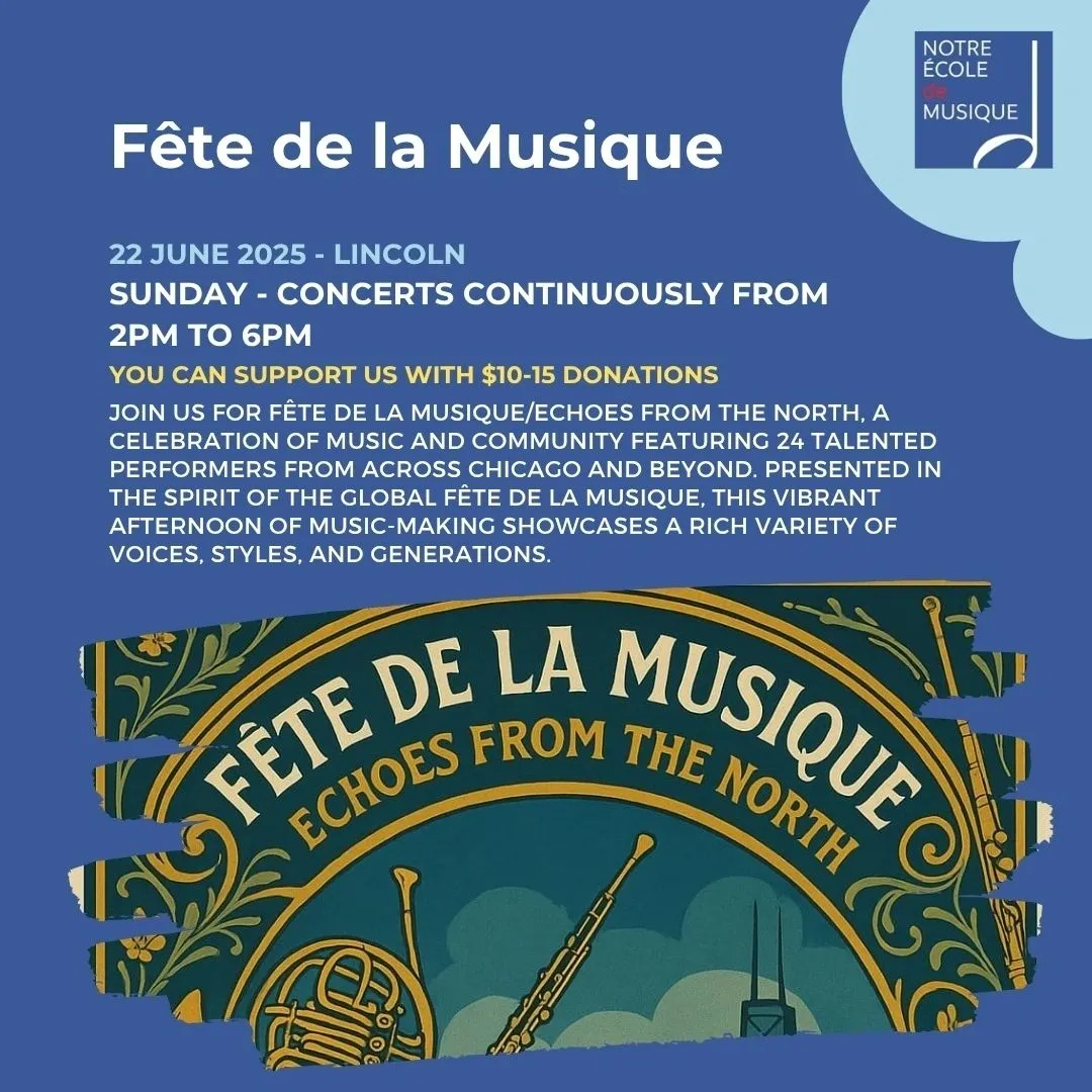 Join us for Fête de la Musique/Echoes from the North, a celebration of music and community featuring 24 talented performers from across Chicago and beyond. Presented in the spirit of the global Fête de la Musique, this vibrant afternoon of music-making showcases a rich variety of voices, styles, and generations.